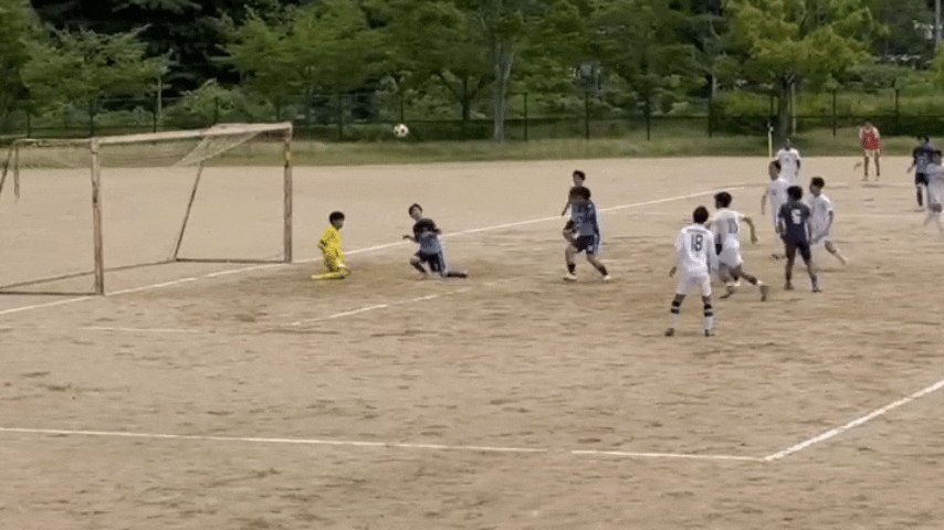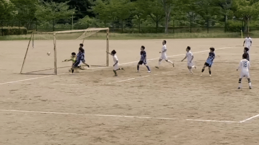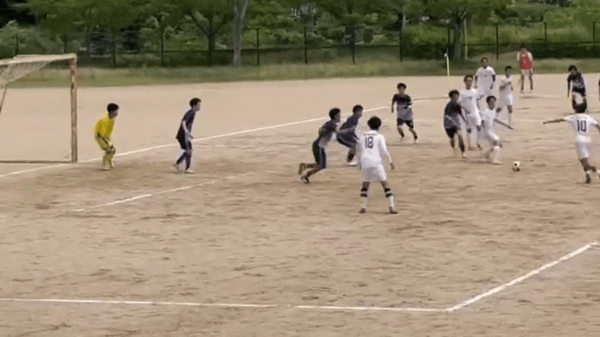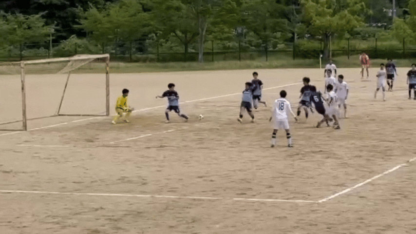 入道からストレートの速い縦パスをマサ胸でダイレクトでスペースへ落とし、そこに、走り込む山下くんが抑えながらシュートするも、少し枠を外れる。