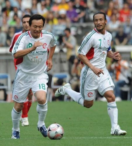 落ちたボールを拾いに行くのはもちろん蹴った本人、釜本。