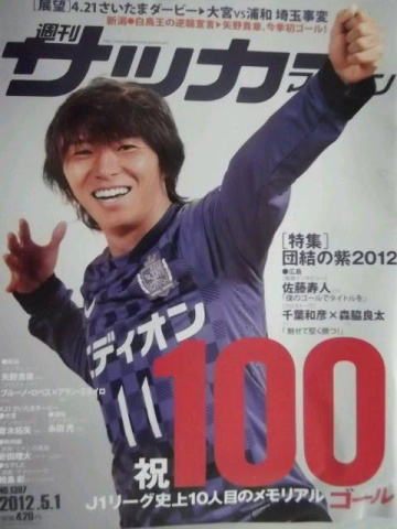サッカーマガジンの表紙サンフレッチェ広島・佐藤 寿人李 忠成ゴール決めポーズで決める。