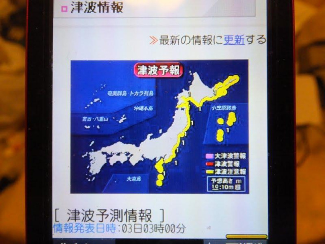 津波注意報 発令伊豆諸島・小笠原諸島千葉・房総半島~北海道太平洋沿岸海岸に近づかないように、高台に避難して下さい。