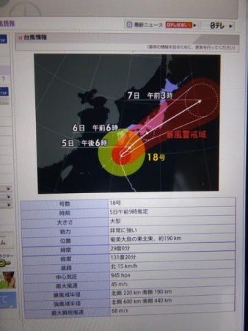 台風18号が明日朝に関東に接近する恐れがあります。