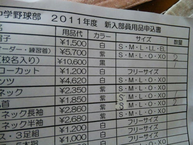 なんだろうと見て見ると、サーの野球部入部に際しての用具購入用紙でしたが………