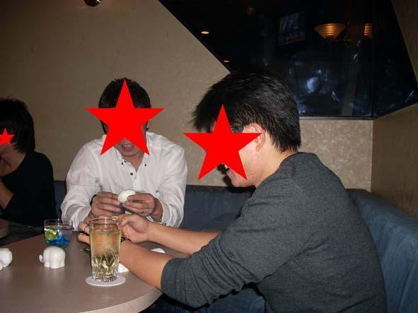 とりあえず店に着いたとたん何故か「ゆで卵」をむき出した二人をのせておきます。(攻守の要、元キャッチャー氏/左とみねみね氏/右)