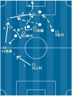 さらに中央で(巧みなフリーランニング、ウェーブの動きで)フリーになっていた高橋へ横パス(3)。