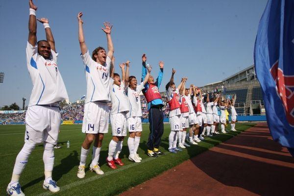 奇跡の勝利の喜びをサポーターと共に分かち合う選手。