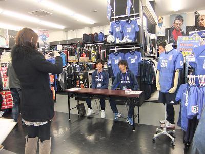 本日の我がクラブは、開幕戦スタメン予定メンバーは非公開の東京VとのTMを行いましたが、地元に戻ってきたメンバーは太陽スポーツに数名ずつ別れての始めてのイベント「1日店長」を行いました。写真は太陽スポーツ砺波店の様子です。砺波店の方には森泰次郎・吉川健太の2名が参加してくれ今日発売になったオーセンティックユニホームの販売や開幕戦の告知やサイン会などを行い大勢のサポーターとの1日触れ合う場になりました。