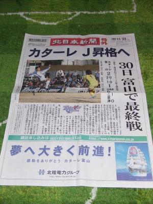 昨日のJFL後期第16節カターレ富山vsMioびわこ草津戦(湖南市市民グラウンド陸上競技場)の戦いから一夜明けての本日の朝刊の一面は、とやま・いしかわ版のスポーツ報知だけでしょうがジャイアンツではなくカターレ富山が一面にデカデカと載っていました。