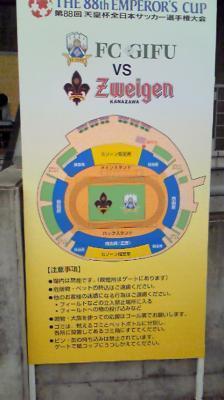 今日は運営側ということで実際のところ試合展開は見ることができませんでした。結果としてはFC岐阜が88分に相川のゴールで1−0の勝利で4回戦の東海ダービーへ進むことになりました。本日の入場者数1515人の御来場がありました。FC岐阜のサポーター及びツェーゲン金沢のサポーターのみなさん本日の御来場誠に有り難うございました。両県に納得頂ける運営が出来たんではないかと思います。