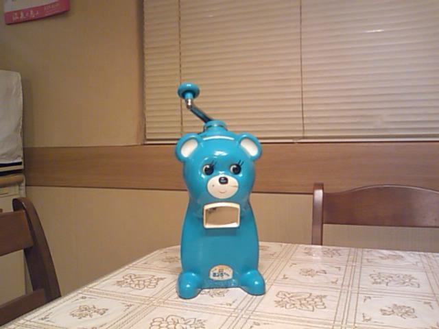 懐かしくないですか[e733] 頭の中に氷を入れてハンドルを回すと、目がキョロキョロと動くのと同時にあごの下からかき氷が出てくるというシロモノ。回す労力の割にはかき氷の生産量が低いというもの。でもキョロちゃんのかき氷、無性に食べたいっ[e415]