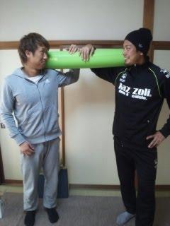 二人でなんかないかって探した結果、ふと置いてあったストレッチポールで無理矢理絆を表現してみた結果がこれや(-_-;)!!