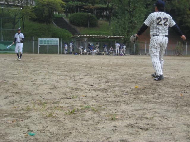 1試合目終了後、ポロ松さんにノックを打ってもらってる、どかべんさんです。ぼくと2人で受けたのですが、どかべんさん、すごくツラそうでした。前回お会いしたときより、ちょっとお太りになったようです。もうちょっとダイエットしてみてはいかがでしょうか?余計なお世話かもしれませんが、そのほうが、もっと野球が楽しくなるのではないでしょうか。どかべんさん、いろいろアドバイス、ありがとうございました!