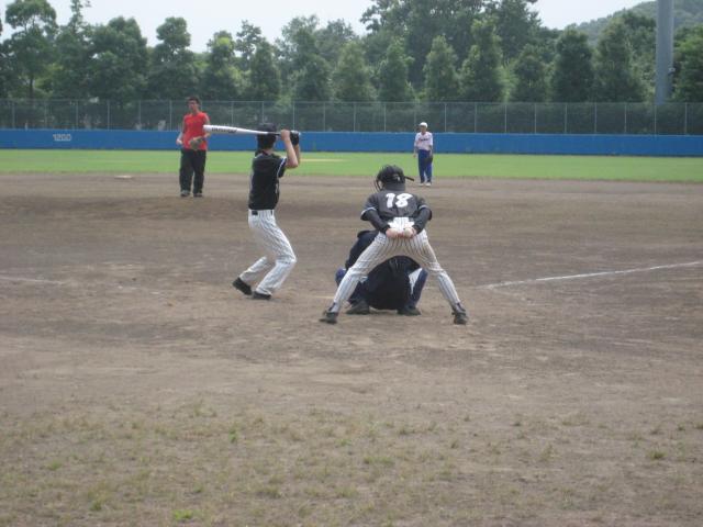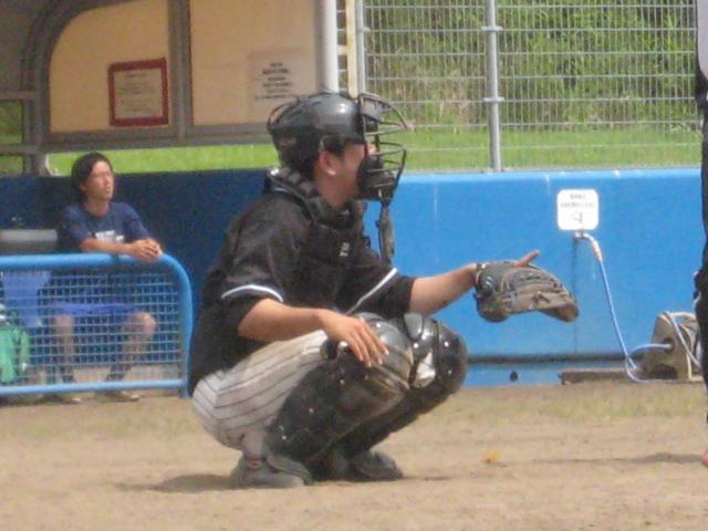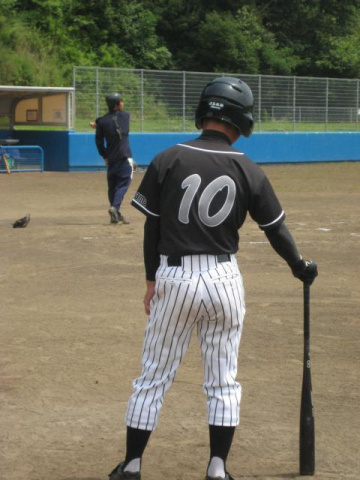 ウチのキャッチャーのFくんです。まだ高校生です。今シーズンから、キャッチャーをやってもらっています。先日、ハタケヤマのキャッチャーミットを誕生日プレゼントでもらったってうれしそうに持ってきていました。なお、彼ですが、スラパンではなくて、なぜか、ユニのパンツの中にモモヒキを履いてくるんですよ。若いのに、すごくオヤジくさいヤツです(笑)。でもそれがしっくりくるそうです。ちなみに、彼、チームの四死球王で、今シーズン1試合当たりなんと2!今日も2回ほど、デッドボールがありました。それでも出塁して、チームに貢献してるんだから、それはOKなことですよね。