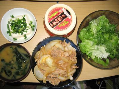 おまけ。今日の夕食。豚肉が特売だったので、豚丼を作ってみました。やっぱり豚肉は栄養もあっていいですよね。あとは消費期限を4日過ぎた豆腐(だから湯豆腐にしてみました 笑)、サラダ、キムチ、わかめシジミのみそ汁です。