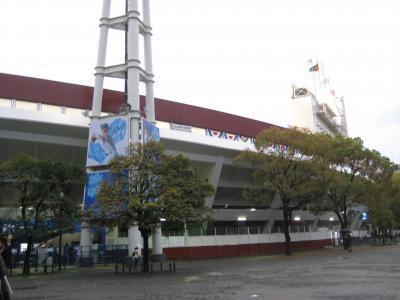 今日は実はハマスタに行こうと、青いぴちアンを服の中に着て、応援グッズも持って行きました。朝から激しい風雨でもう中止だろうと思っていました。ところが、どうやら、試合を強行する模様でしたが、雨も止まなかったし、非常に寒かったので、無理に行くこともないと、やめて帰ってきて、TV観戦することにしました。写真は今日の会社帰りのときに撮ったハマスタです。