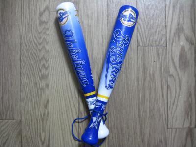 やっぱりこれも必需品ですね。昨シーズンから新発売になった、ちょっとだけ太い応援バットです。たたくといい音がします。