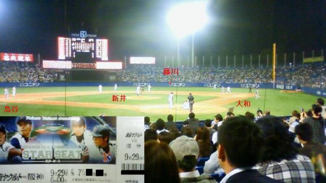 先頭・鳥谷レフト前、金本凡退、新井四球、柴田三振・・・ツーアウト一二塁。