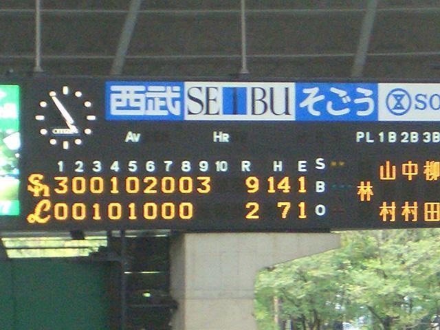初回のその立ち上がり、すんなりと2死をとられる。今日の西口はストレートも走っている。3番田上のサードゴロを“おかわりくん”中村がファンブル。信彦がショート後方へのポテンヒットで続き、ズレータは外のスライダーをチョコンとセンター方向へ。これが意外に伸びてバックスクリーンへ。先制の3ランとなる27号弾!