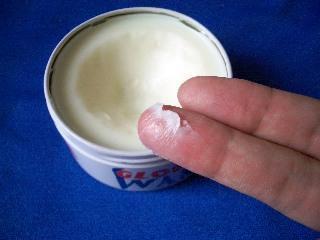 このワックス、少し粘り気があり、グラブの中でボールが暴れるのを防いでくれる。ただし、塗りすぎるとグラブが重くなるので要注意。また、一般的にオイルを塗ると革が柔らかくなりやすいので、あまりどこでも滅多やたらに塗るとグラブ全体が柔らかくなりすぎて型崩れを起こしたりしやすくなる。