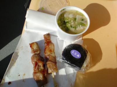 豚トロ串に豚汁の豚づくしに、SAで買ったしじみおにぎり。