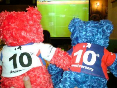 写真は、パブにいた青赤ベアと観戦するの図(笑)。