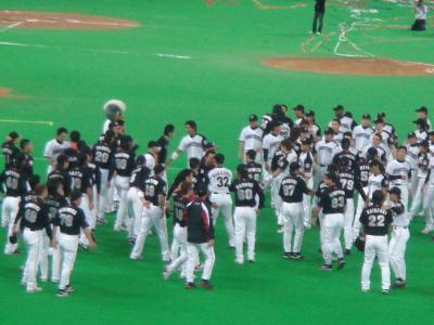 最後にゆっくりと里崎がベンチへ引き上げて行きましたが、その際に1塁側(ロッテベンチ側)の日本ハムファンからの声援にも笑顔で手を振って応えていました。