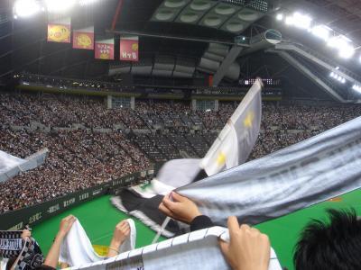 最初の里崎のHRの時、レフトスタンド1列目に飛び込んだようなのですが、こちらからはそれがよく見えず。ハムファンもロッテファンも沈黙・・・。