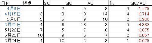 全試合を確認する時間の余裕は無かったので、交流戦以降の4試合と、上記の4点未満の3試合、計7試合のアウト内容を数えてみました。併殺はゴロに1つ、他に1です。