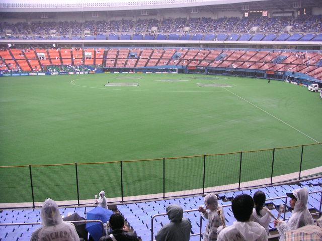 球場へ出かけると、雨は強くなるばかり。