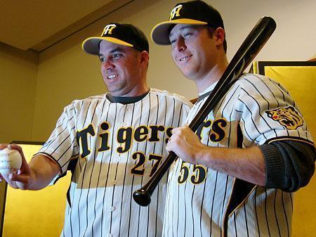写真は、今季阪神入団のアッチソン投手(左)とフォード外野手(右)。