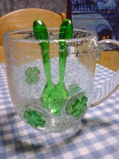 縁起かつぎに四葉のクロ-バ-のグラスマグ...買っちゃいましたぁ-(^O^)/たまたま見つけたンだけど...ちょ-お気にdesu☆″アワアワいっぱいのガラスなんですっ(*^m^*)