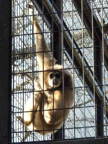 そして他にも、いつもいるんだかいないんだか分からないくらい活動していないテナガザル。行くといっつも広い檻の一番上でグデ~ンと寝転がっているおサルくんが、この日は珍しく顔を見せてくれていたので、とっさにカメラを向けちゃいました[d140]