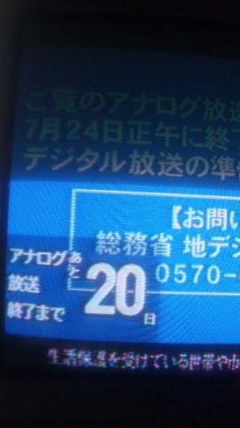けれども左下にデカデカと「アナログ放送終了まで○○日」って出るのは、政府とテレビ局が一体となって嫌がらせをしているとしか思えないf^^;;;