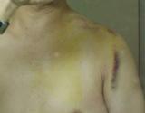 汚い写真で恐縮ですが,私の再骨折9日目の写真です.写真でお分かりのように右肩と上腕に黒い内出血があります.転倒時に地面に当たった部分だと思います.前回の時は,このようなものではなく全体的に黄色くなっている部分だけでした.それだけ,衝撃の大きさを窺い知れます.