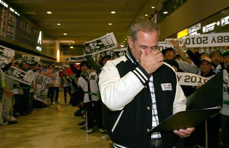 大勢のファンに迎えられ再来日したロッテのボビー・バレンタイン監督は思わず「男泣き」=成田空港(撮影・春名中)