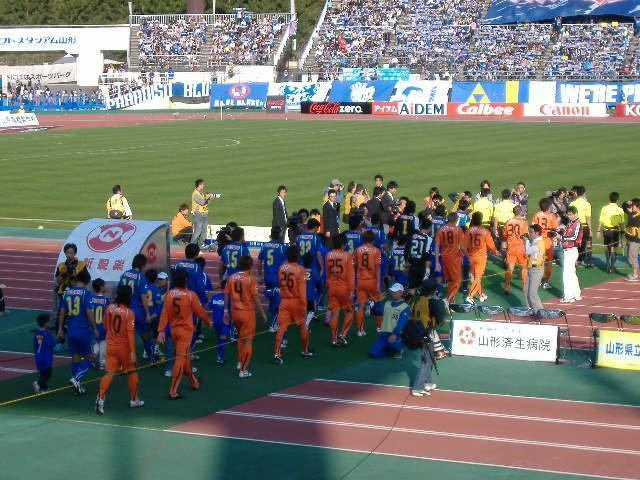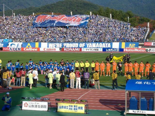 昨日の天童市では天候も良好でスタジアムからは山岳の稜線が間じかに目にすることが出来た。自然豊なロケーションが十二分に味わえてなんだか心が和む空間を醸していました。そんなスタジアムのスタンドでは山形のサポータ色のブルーが一際映えていた。モンテディオ山形を応援しているサポータ勢の盛り上がりを見ているとこちらも愉しくなるもんです。ここでもスタジアムの内外ではいろんな催し物が行なわれていて賑やかでした。