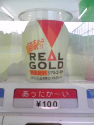 玉蹴りの予定がしばらくないので(泣)、玉打ちにゴルフ練習場に行った時のことです。間違いなのか?こういうのがあるのか分かりませんが、「あったか〜い リアルゴールド」を発見しました!炭酸の行方と味が非常に気になりますが、怖くて買う気にはなりませんでした・・・・。