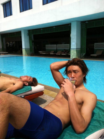 しかし、写真は、練習後にプールでリラックスしてる時なんだけど…