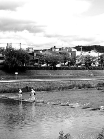 鴨川を素足でキャッキャと渡る外国人アベック。