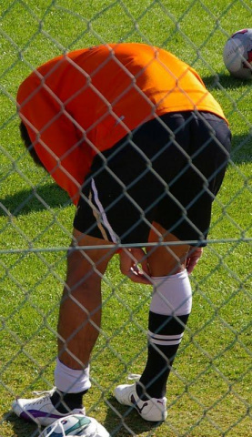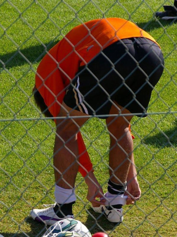 シューズの紐を結んでいる模様。