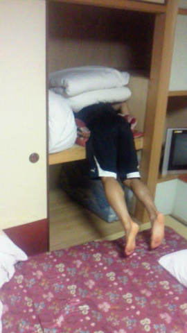 どうやら寝ようと思って布団を敷こうとしている最中に力尽きてしまった模様です(笑)