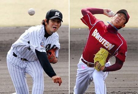 練習試合でともに先発した楽天の田中将大(写真右)とロッテの大嶺祐太。両投手とも2回を投げ、田中は無失点と力投。大嶺は4点を失ったが2三振を奪った。試合は楽天が7―3で勝った(26日、鹿児島・鴨池球場)