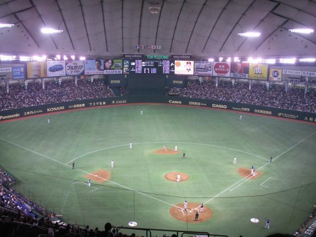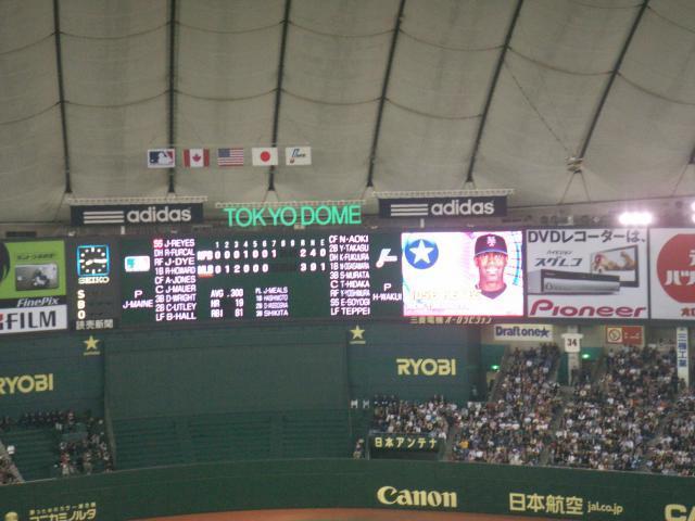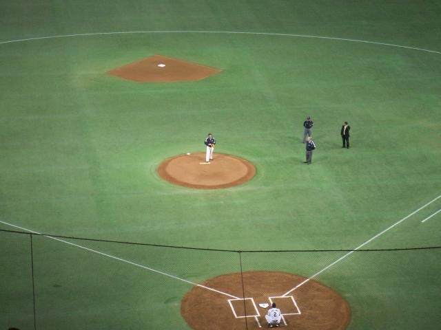 さて、今日の球場の雰囲気は、普通のプロ野球とは違います。鳴り物禁止、応援団いません、そして、やっぱり、外人(アメリカ人?)がたくさーんです(フィールドじゃないですよ)