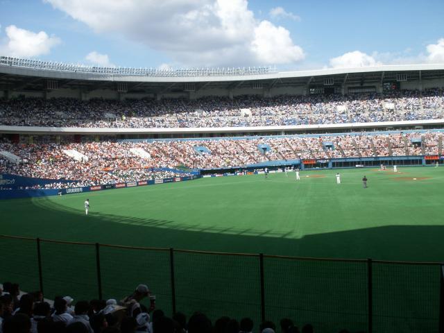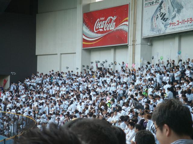 11時に会場するも、30分近くスタンドに入れず、それくらい混んでいたけど、ライトのポール真後ろの席を確保できました。通路から2段目。隣は若い女性で、反対は、席とりだけ・・・・試合開始ごろに一人登場したけど、その人だけ、おいおい!ライトに入れない人、それでも入れなくて立ち見の人もいるのに・・・。