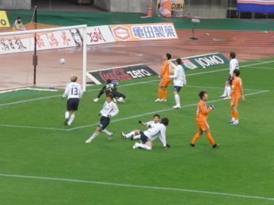 MF、DF4人ずつ2ラインで守る柏に手詰まりの新潟。左サイド松尾が何度もフリーで手を挙げるがボール出ず。ジウトンがいたら(負傷のため欠場)。終盤ヨンチョル、エヴェと投入、パワープレーに入るが最後まで守備を崩せず。タイムアップ。