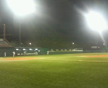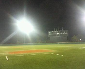 結果はというと、34−3(くらい)のボロ負けでした^^;(←あ、ラグビーの試合ちゃいますよ!!)別に強いチームだとは思わないんですけど、ちょっとレベルが違いすぎる感じだったな^^;初回に14点取られた時には、終わるんかな・・・なぁ〜んて思っちゃいました^^;ピッチャーはボールは早くはないんだけど、今日も決してにコントロールは悪くなかったんです。けど、なんともまぁ打ち損じの無いこと。何本もキレイに外野へ・・・。初ナイターの上に初心者の多いチームなんで、そりゃもう捕れない捕れない^^;アウト1つ取るのも一苦労でした・・・。。。でもでも、守備が下手なのは仕方ないこと◎あんなの経験だって超重要なんです。特に外野なんて。。。おれは元々外野なんでよくよく気持ちはわかります。もっともっといっぱいノック受けるか、試合を重ねていけばどうにかなるでしょ♪もちろんその前に誰かがきっちりと基本だけは教えた方がいいとは思うんだけどね^^;