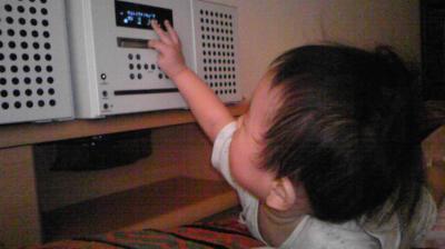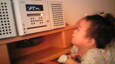 よーせーが生まれてから初めてコンポで音楽流したら食いついた☆