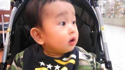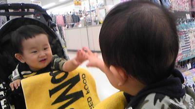 なんとか事務所から抜け出し今日はジャスコにお買い物♪ベビーコーナーに設置してある全身ミラーによーせーを連れてった♪すると鏡に映る自分を見て興奮♪「おぉぉぉ!誰やっ!」「このかわいいボーイは誰やっ」あんただよ。