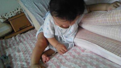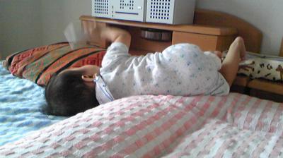 久々に見つけた獲物。自分の寝巻のひも。遊んで疲れる。
