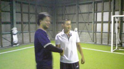 試合前にはピッチの上で代表のタケ氏とがっちり握手。