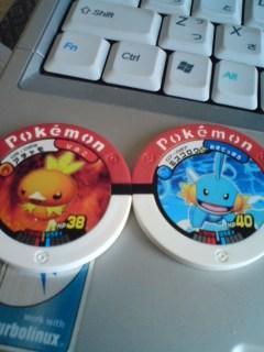 今日バトリオで当たったミズゴロウ(右)。隣はアチャモ。うちの元気と亜茶子だと、性格は正反対だけど息ぴったりなコンビ。